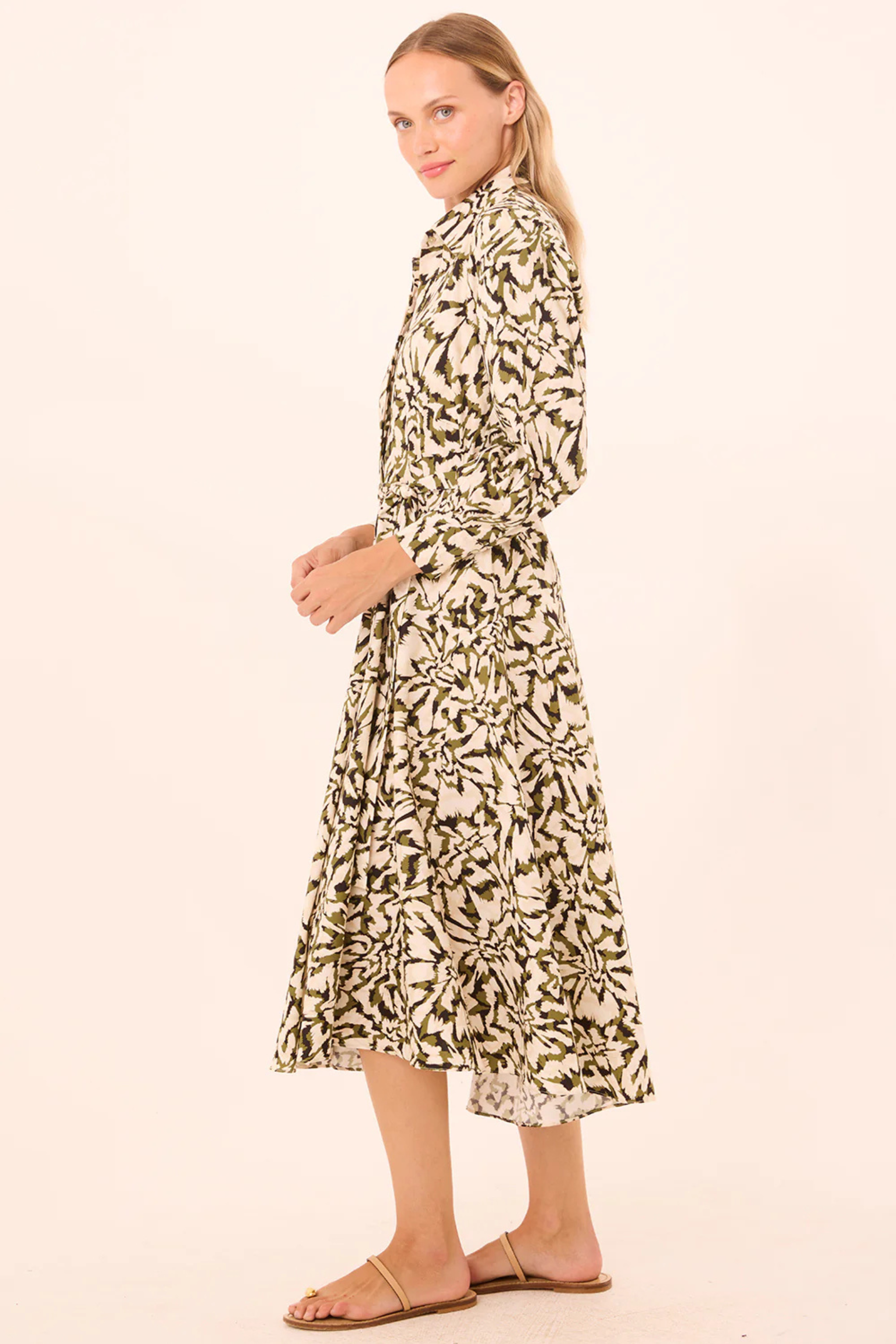 The Lorie dress is a perfect daytime midi cut from abstract Floraburst–printed cotton poplin. Designed in a classic shirt-dress silhouette, it features a foldover collar with covered button closure to the waist, long sleeves with triple-button cuffs, and an optional self-tie belt. A full, feminine pleated skirt adds movement and ease. Style it with heels or pair it with a chic ballet flat for effortless daytime wear.