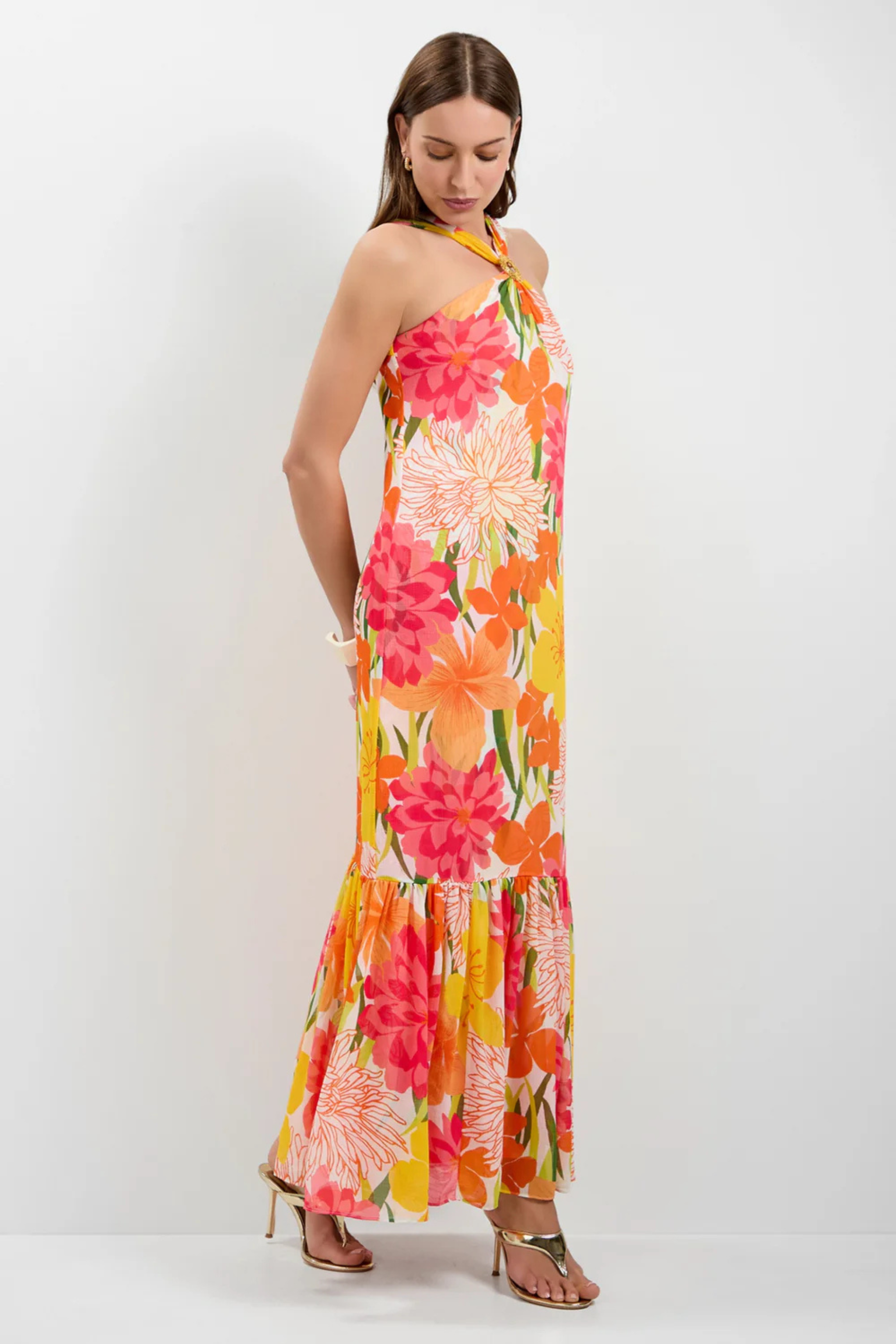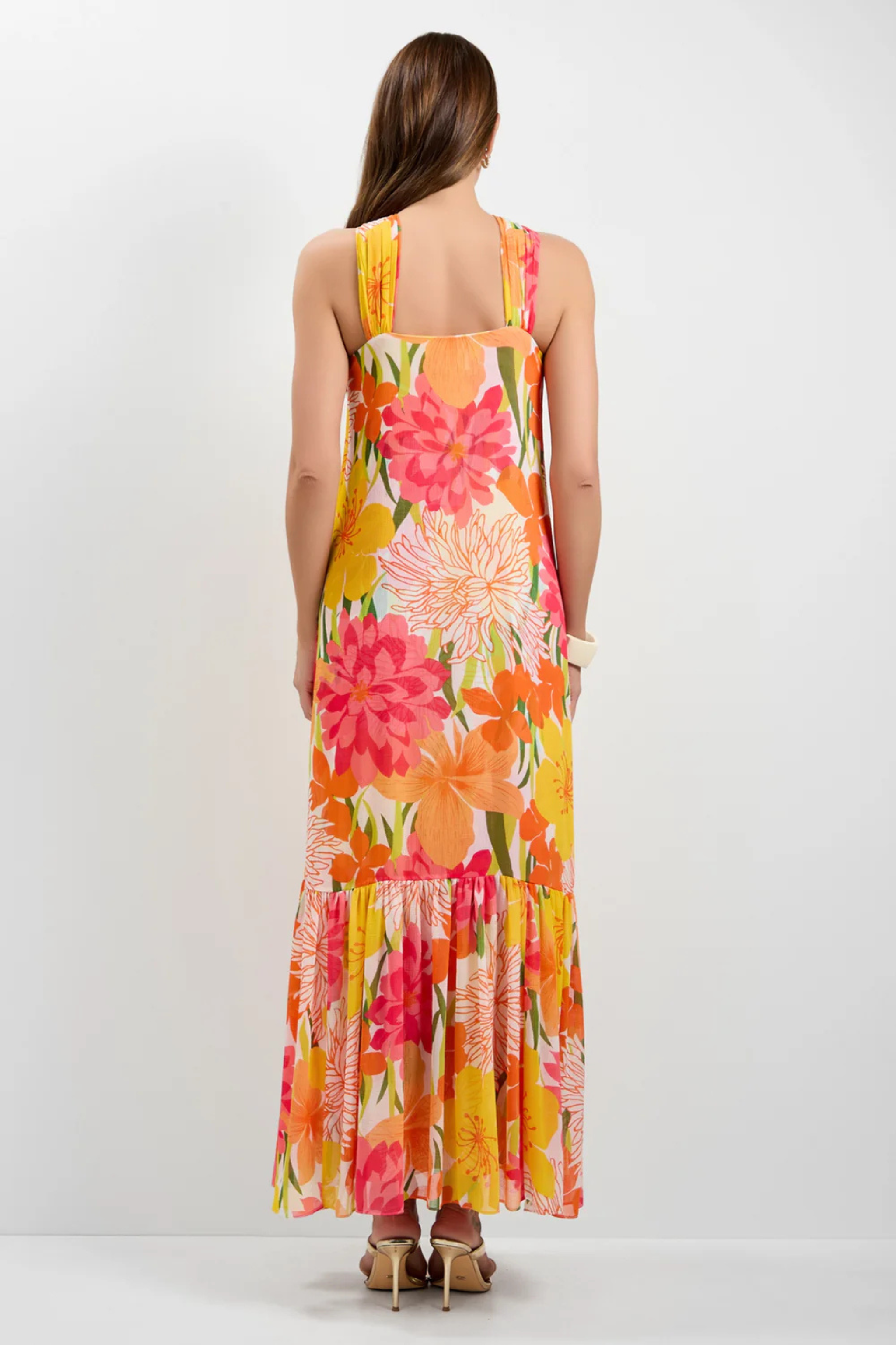 This dress is an absolute spring dream. Featuring an elegant maxi length with a tier at the bottom hem and a twist front with hardware, this show-stopping dress will make an entrance at cocktail parties, weddings, and more. It is made of lightweight crinkle georgette for the perfect balance of comfort and style.