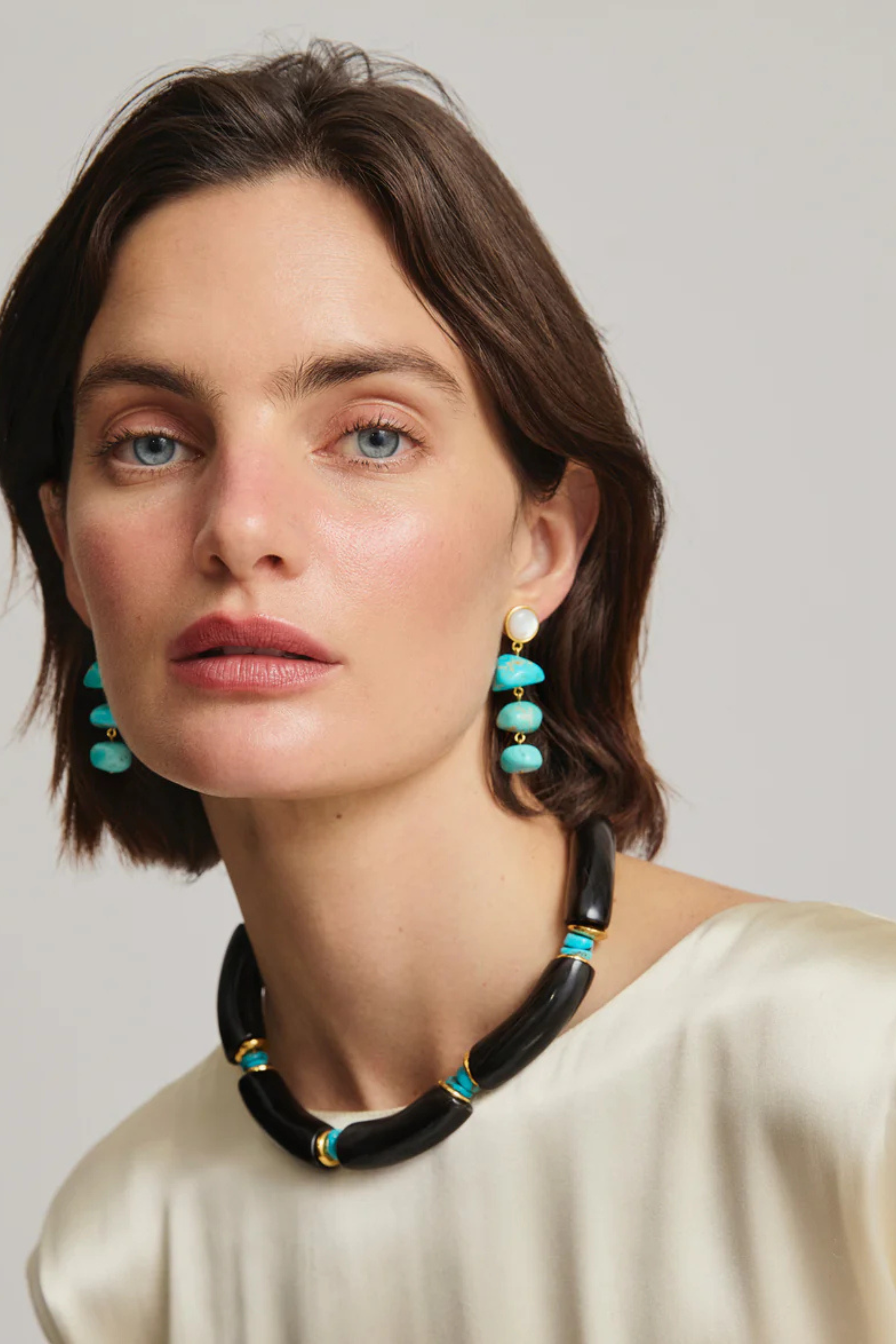 Accessories apathy is ancient history when you don these eye-catching gold-plated brass earrings, with mother-of-pearl tops and linked turquoise bead drops. Lizzie Fortunato uses natural turquoise stones, so each pair will vary slightly in shape, color, and matrix patterning.