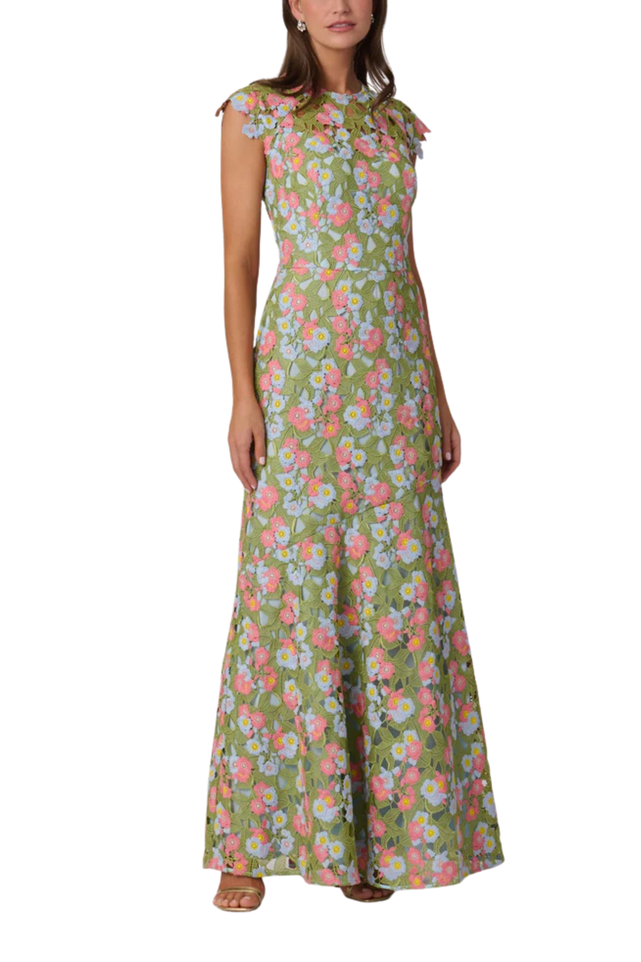 This gorgeous evening gown is made with a beautiful multicolored lace fabric. The lace scallop detail is featured on the sleeves. The Bodice is fitted with an A-line skirt. Bodice is partially lined with a sheer yoke detail, and the skirt is fully lined. Center back invisible zip closure.
