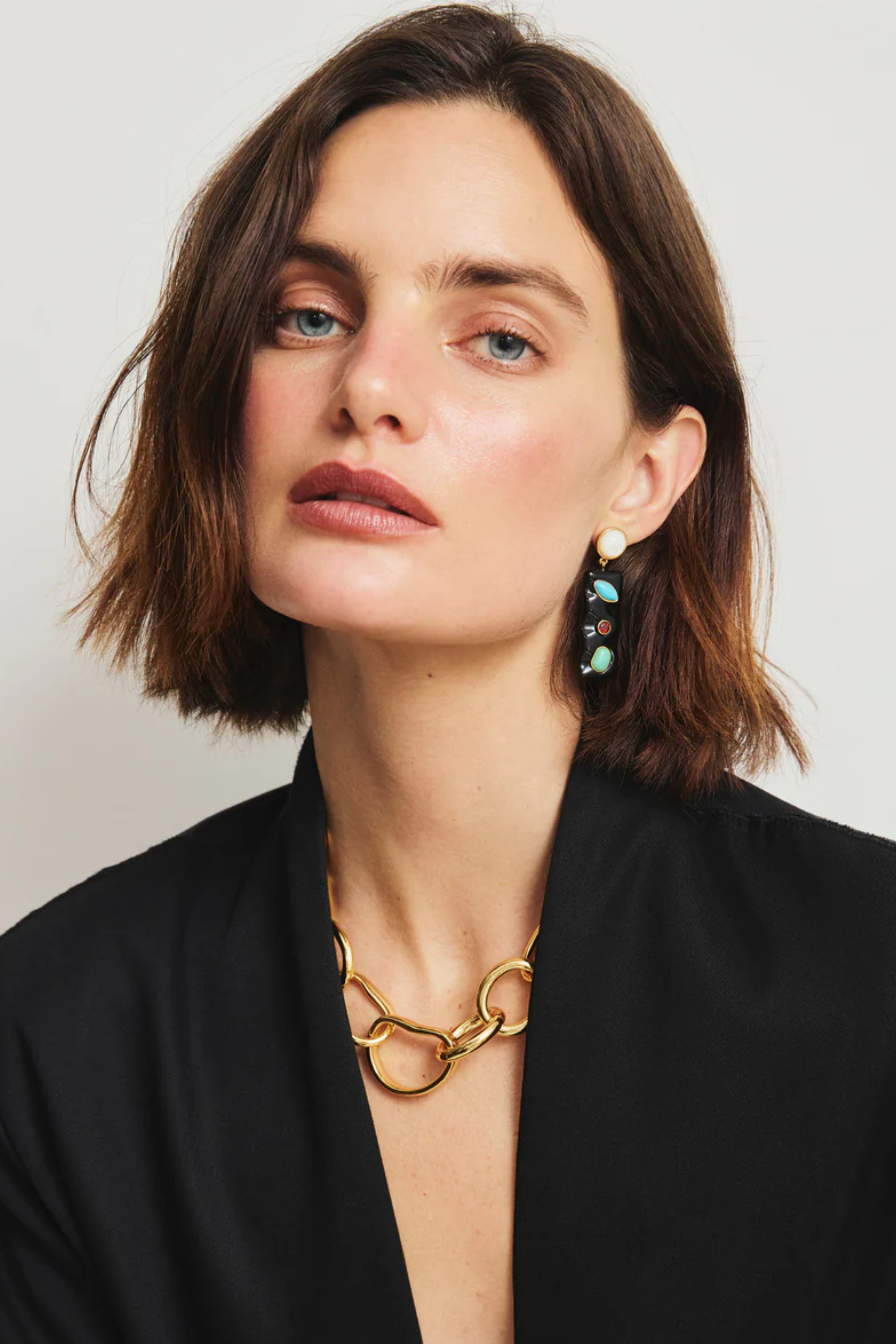 Taking cues from the intricate beauty of Spanish mosaics, Lizzie Fortunato created these artful geometric column earrings with mother-of-pearl tops and hanging resin inlaid with garnet, chrysoprase and turquoise-colored stones.