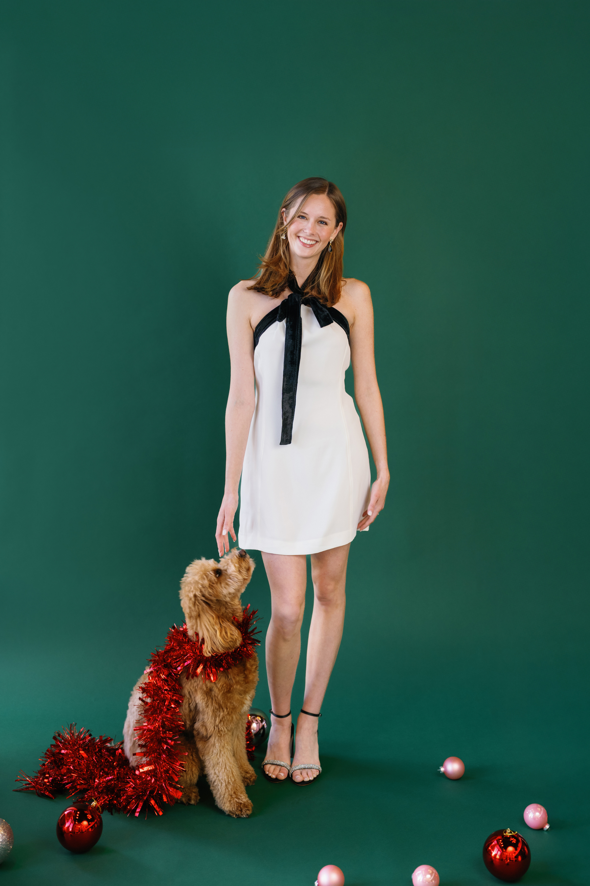This mini dress is crafted in crisp crepe, defined by a velvet halter neckline that ties into a sculptural bow. Features a clean A-line shape and plush ribbon detail to bring depth and contrast. An expression of modern elegance, it showcases craftsmanship through simplicity and detail.