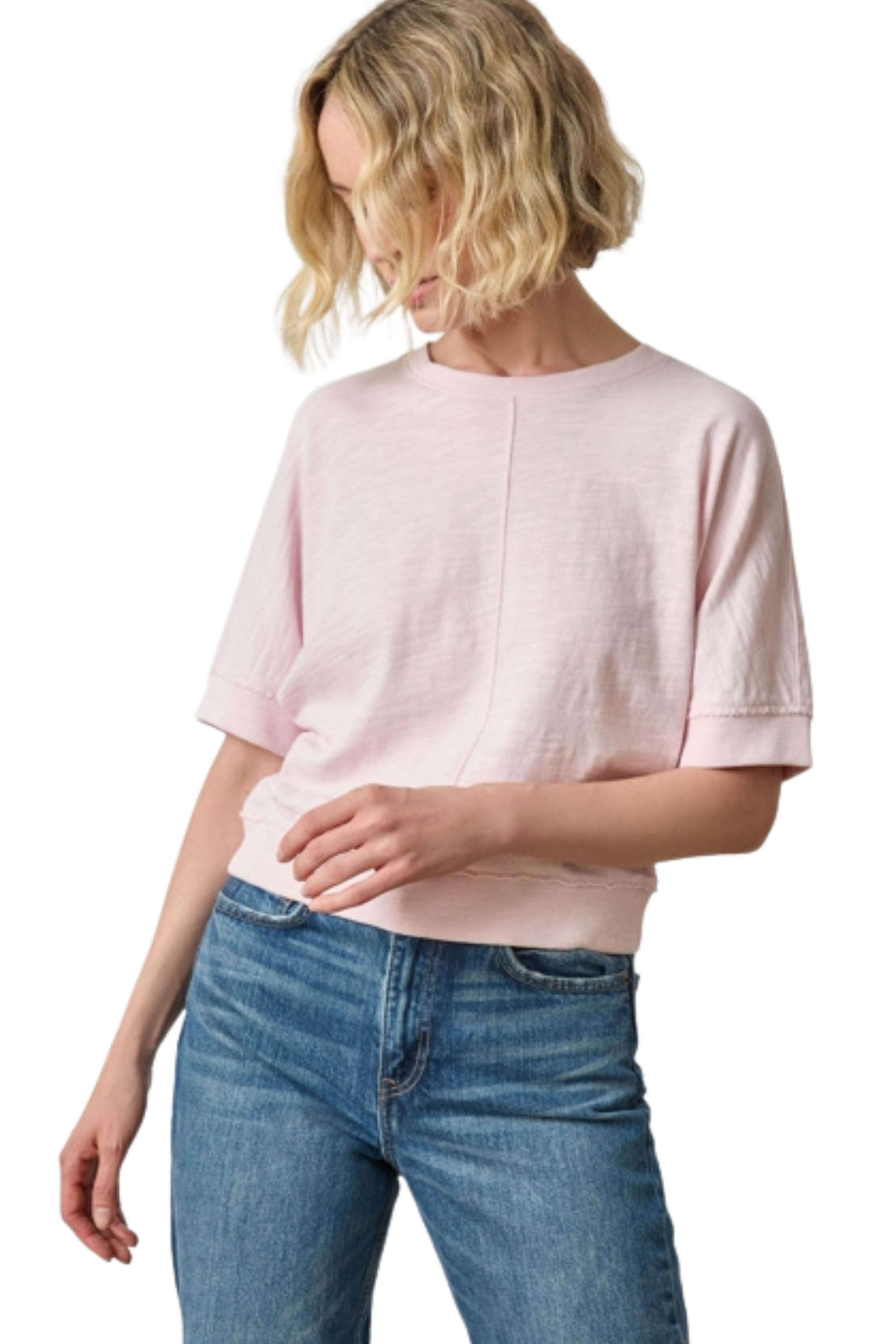 Lilla P's Rib Trim Short Sleeve Tee is simple yet anything but basic. Designed with ribbed trims and a center front seam, the bottom opening draws in slightly to create a subtle blouson shape. Inspired by the feel of a classic sweatshirt, this tee pairs perfectly with your favorite denim or casual bottoms for an easy, everyday look.
