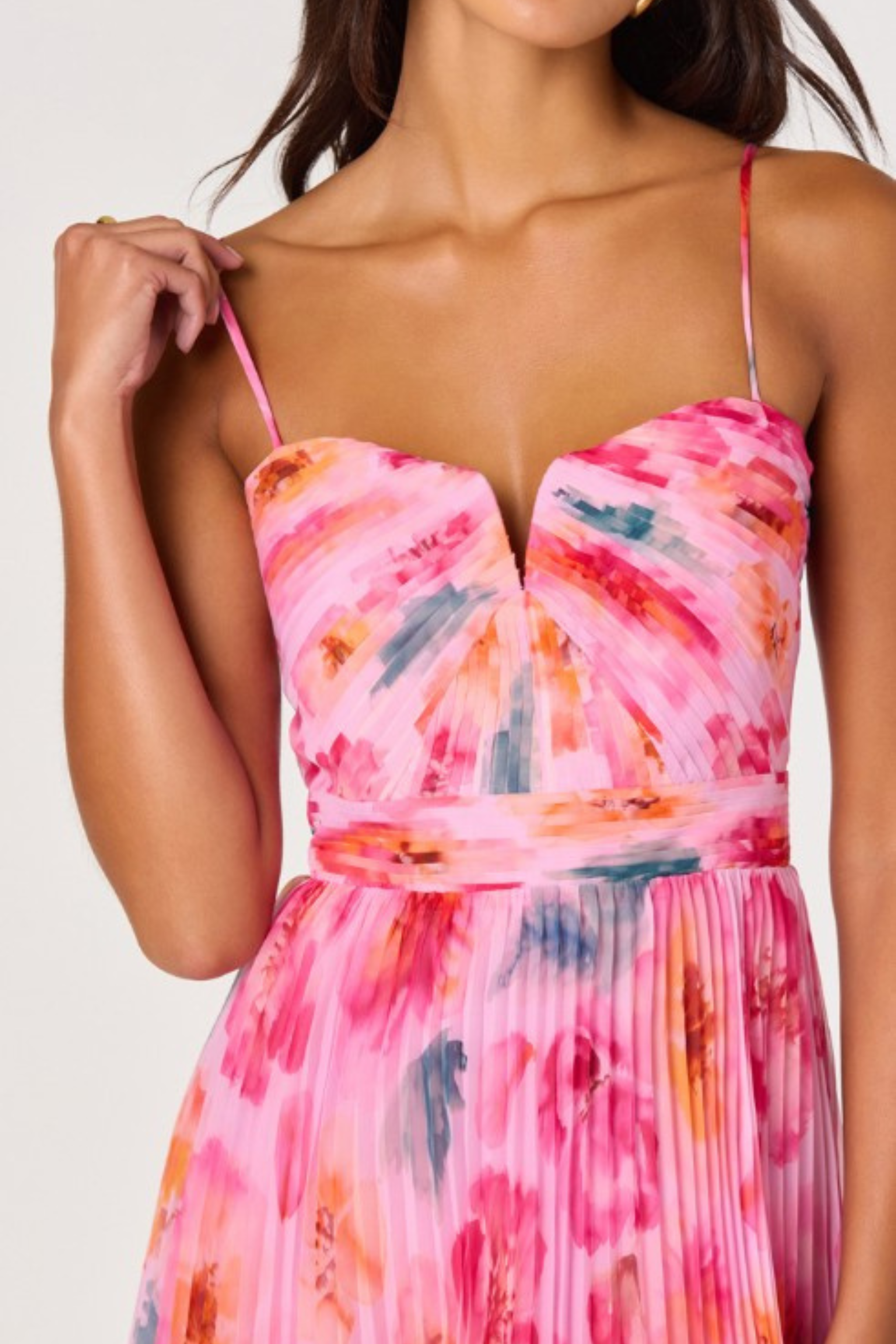 Romantic and effortlessly feminine, the Bayley Dress in Pink Multi Floral from ASTR is made for sun-drenched celebrations and special moments. Featuring a watercolor-inspired floral print in soft pink hues, this midi silhouette is designed with delicate straps, a flattering fitted bodice, and a pleated skirt that moves beautifully with every step. Light and airy, it’s the perfect piece for weddings, showers, and everything in between.
