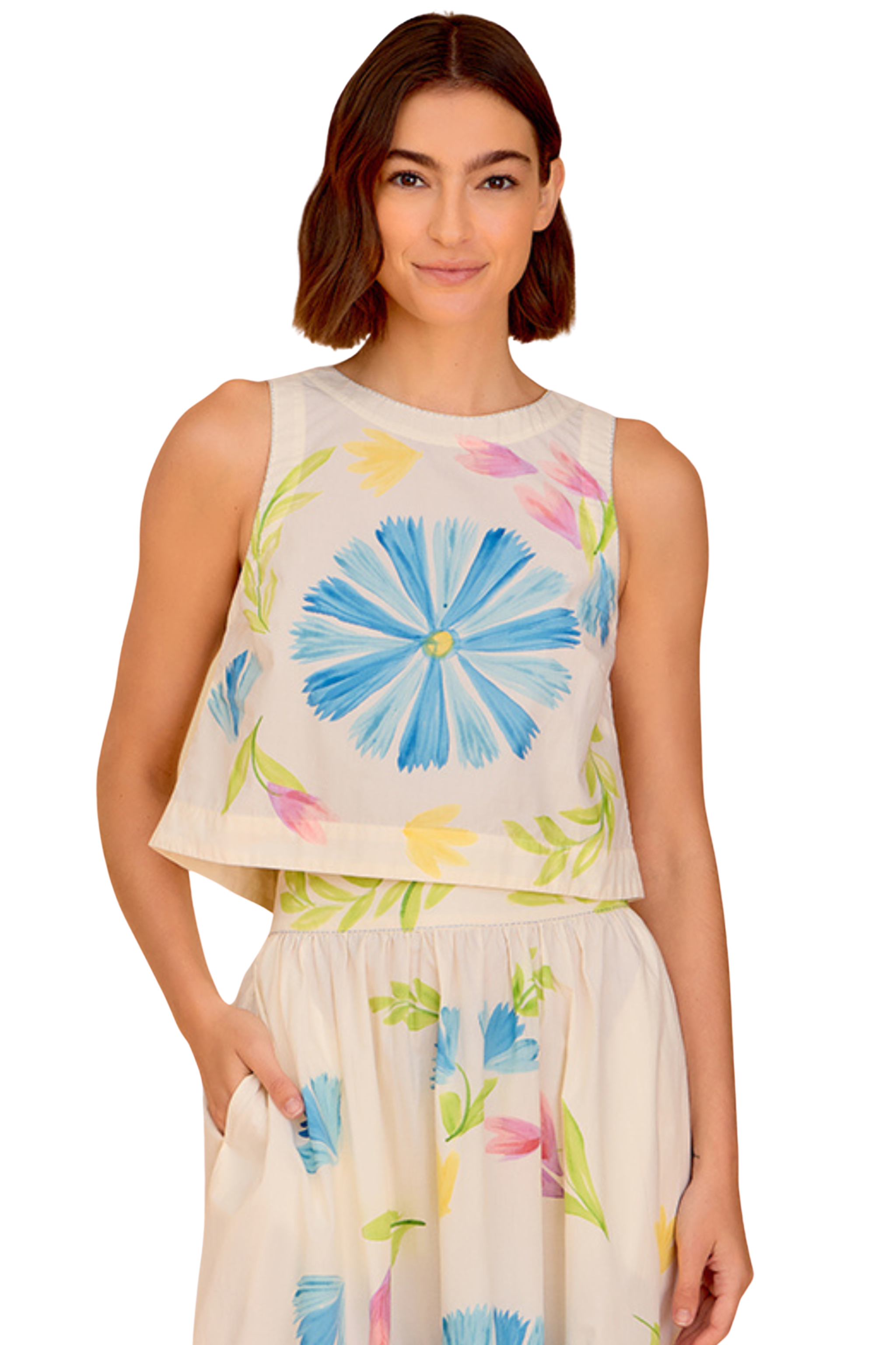 Style this floral crop top with the matching Kit Skirt or high-waisted white denim and sandals for a fresh, summer-ready look.