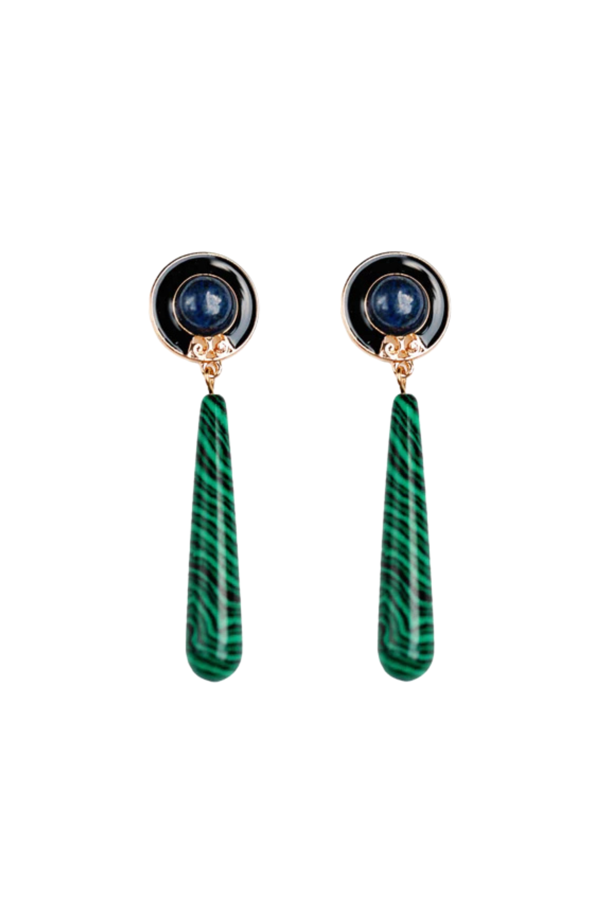 Add a rich pop of color to your look with our custom designed 2.75” Lapis and Malachite statement earrings. Inspired by our travels to Italy, these earrings feature a blue lapis stone surrounded by an enamel circular base paired with a cylindrical custom cut green malachite stone.