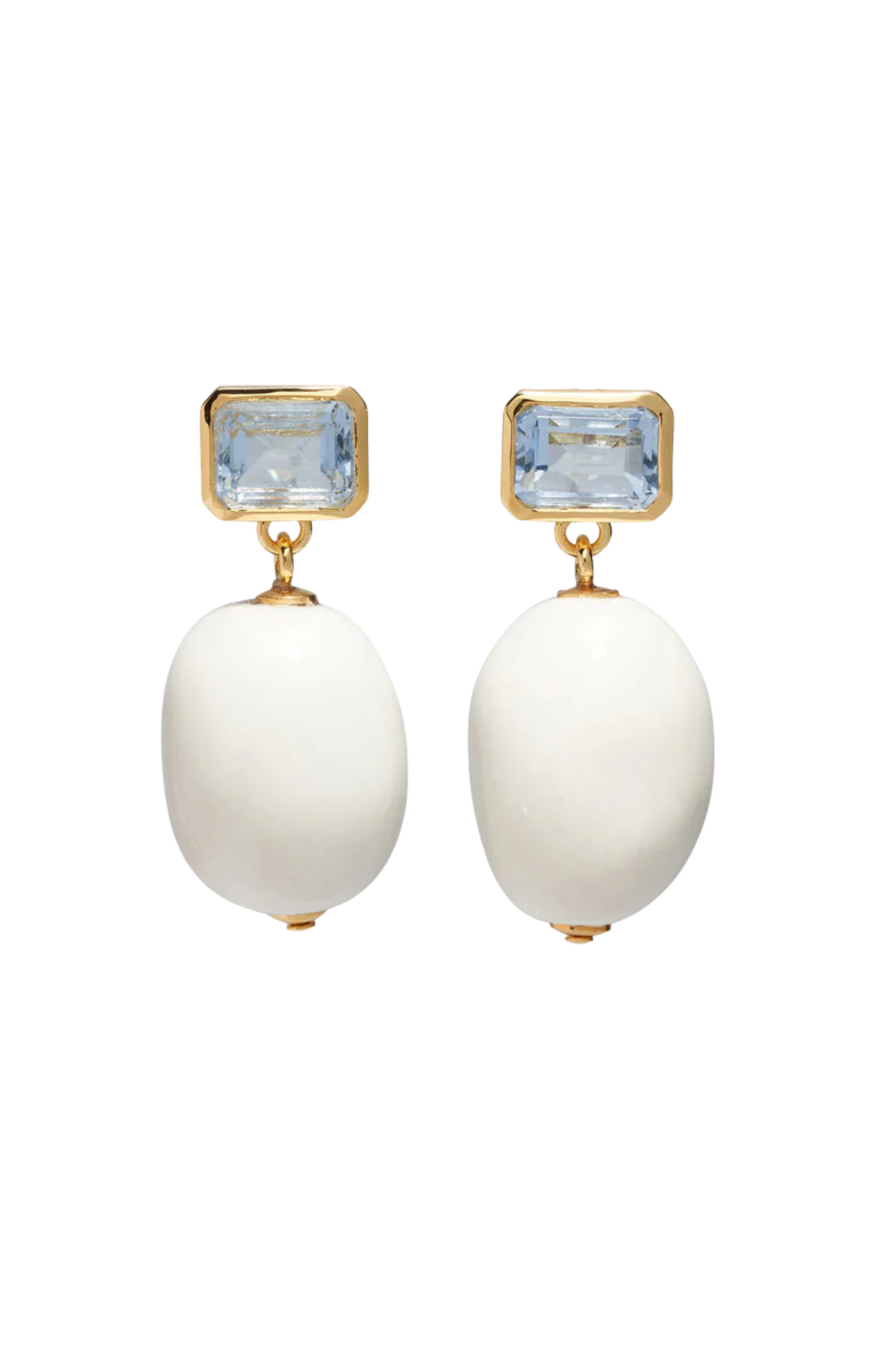 Peace out in sublime statement earrings with pale blue-colored glass baguette tops and handmade ivory-colored porcelain bead drops.