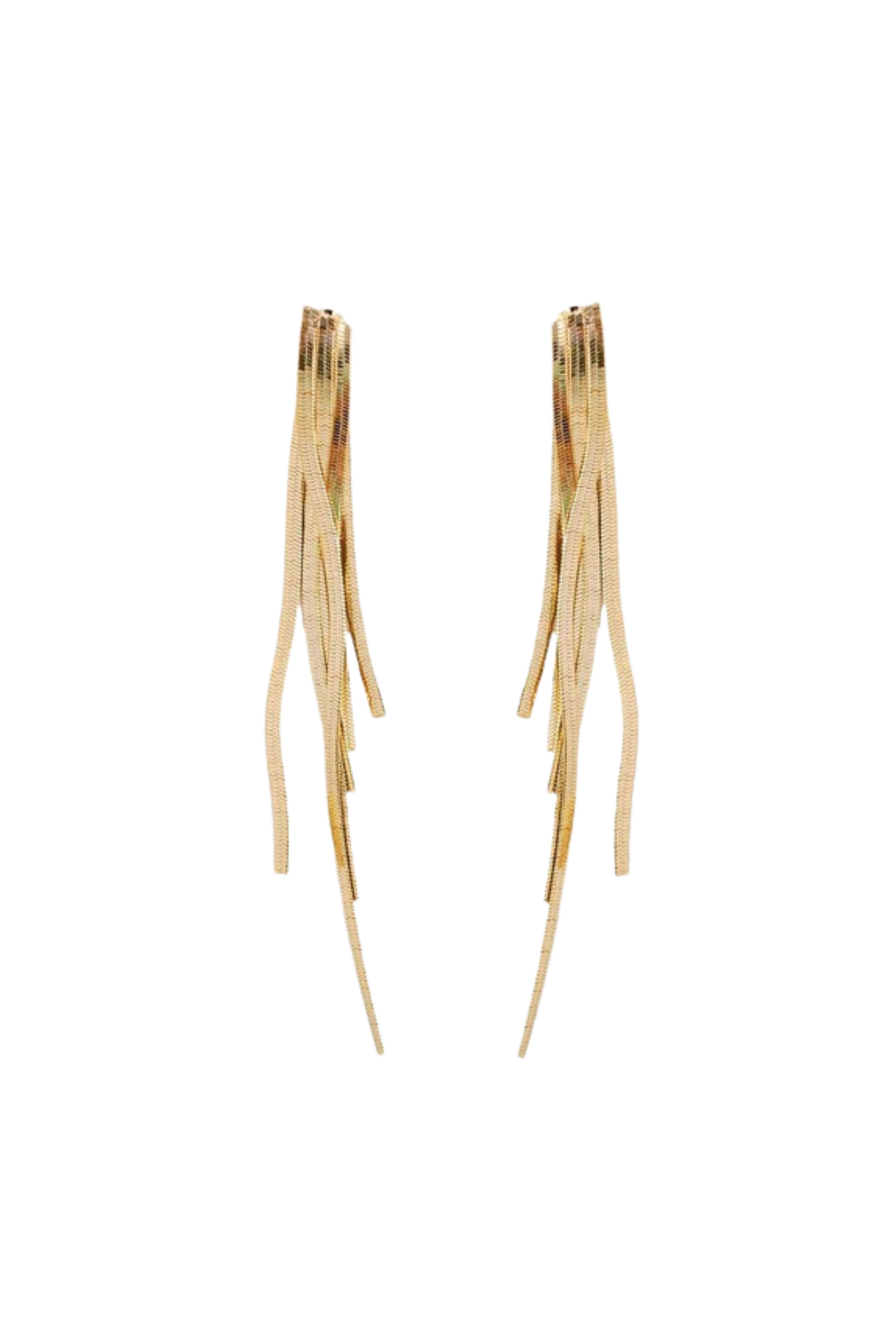 Add a sleek and modern touch of glamour to your holiday ensembles with these stunning minimalist skinny gold tassel earrings. These earrings feature delicate gold chains that gracefully cascade and catch the light, making them the perfect festive accessory.