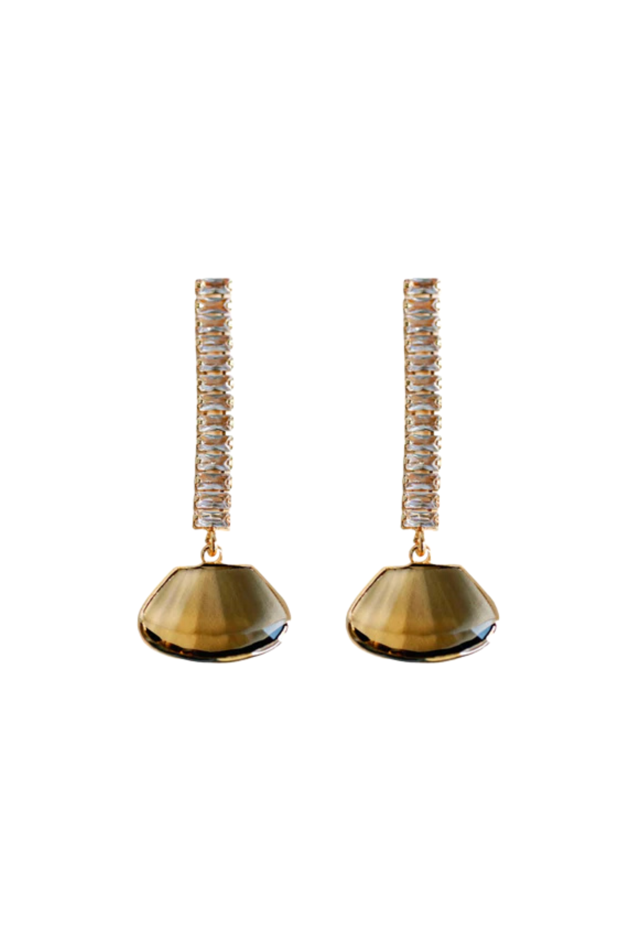 These exquisite 2.5" drop earrings feature a delicate string of interlocking rhinestones leading to a rich faux brown gemstone. The delicate sway of these earrings adds a touch of glamour and sophistication to any ensemble, making them a perfect choice for holiday parties.