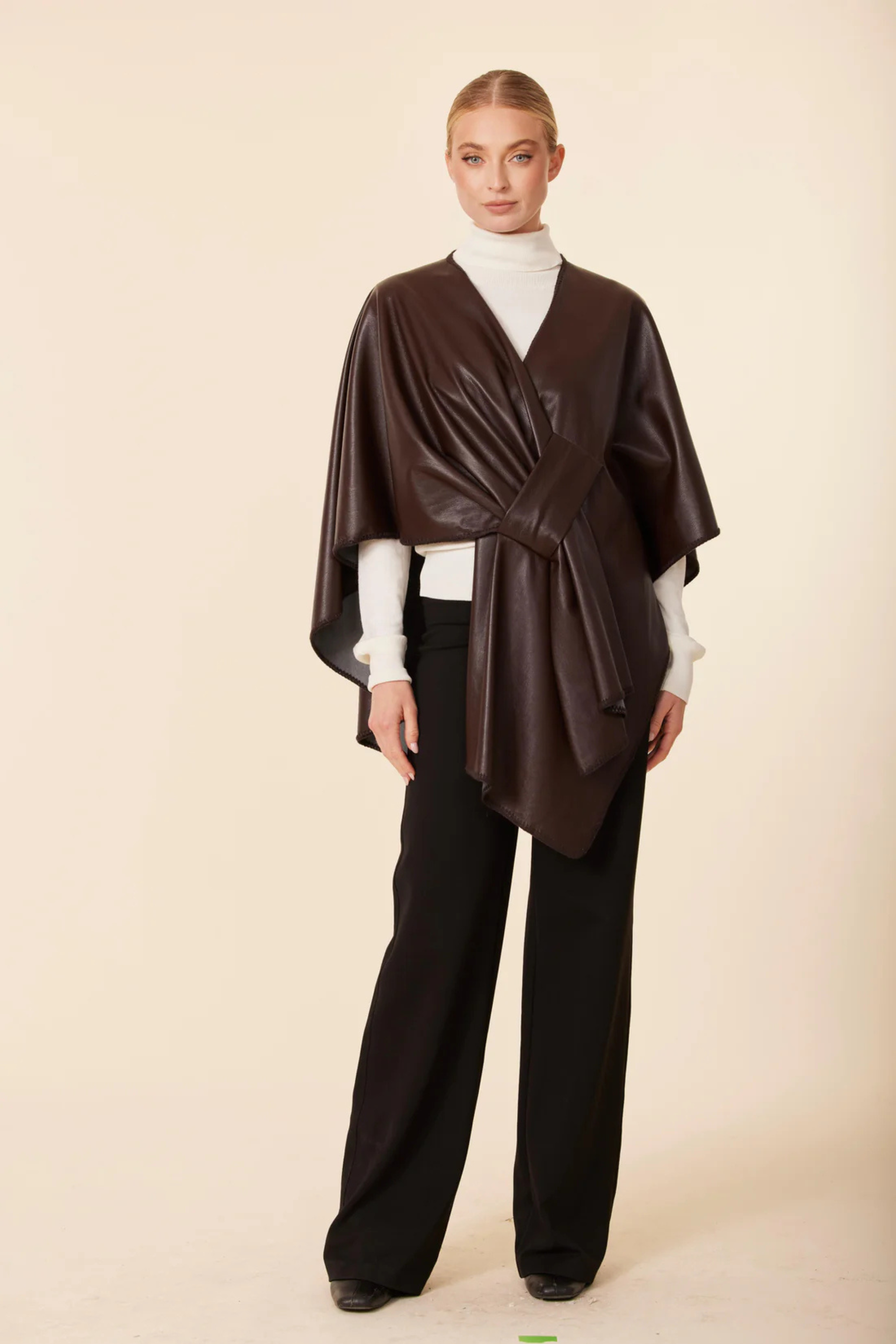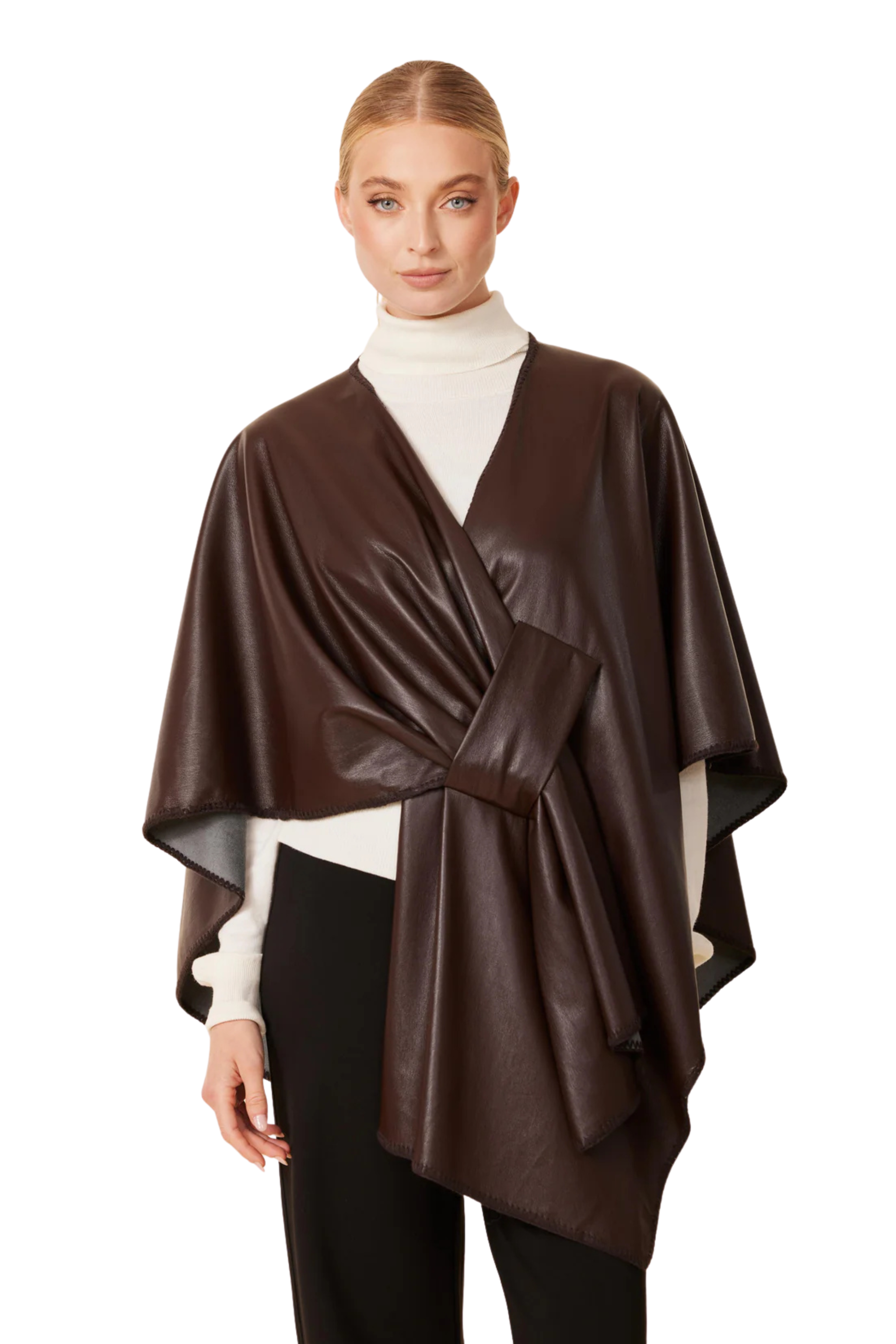 Stay cozy and chic in Dolce Cabo's faux leather wrap, a versatile layering piece perfect for Fall & Winter. Designed with a draped silhouette and soft faux suede lining, this faux leather cape wrap adds warmth and sophistication to any outfit. Pair it with sweaters, tailored pants, or dresses for effortless fall layering and seasonal style.