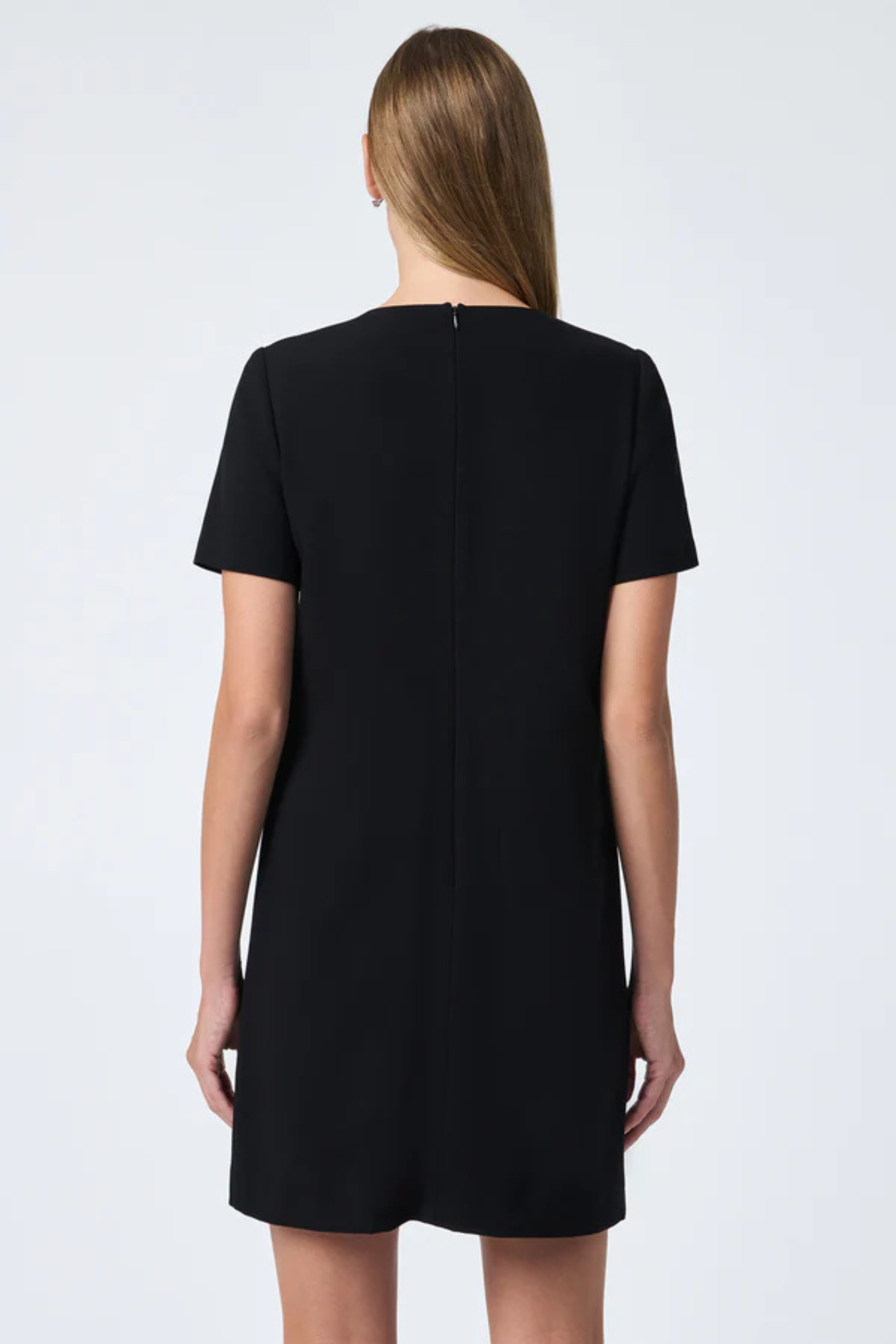 This ladylike mini dress is adorned with decorative bows for a playful look. It features short sleeves, a crewneck, and a center back invisible zip. This sleek dress is made of smooth compact weave stretch suiting for a breezy finish.