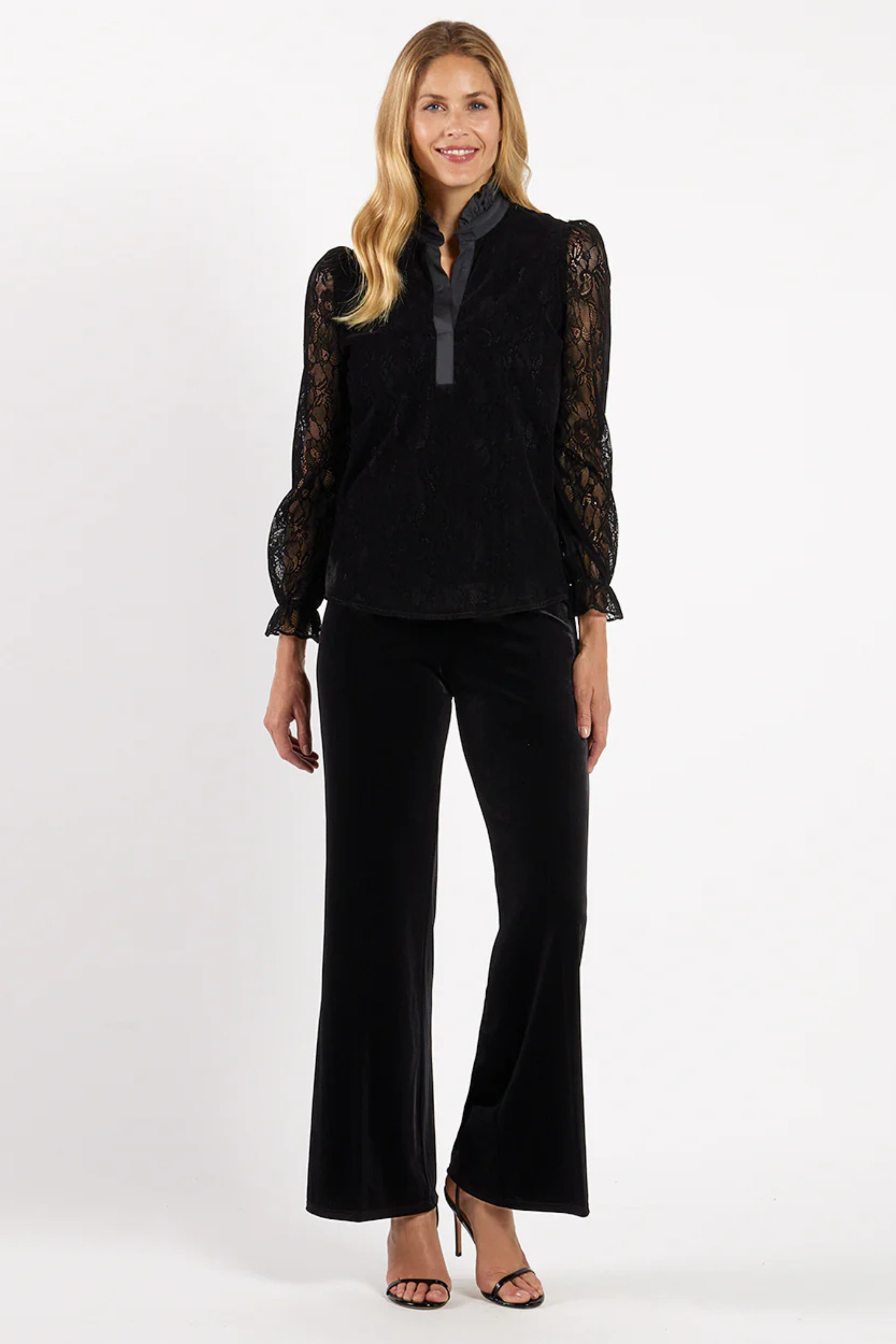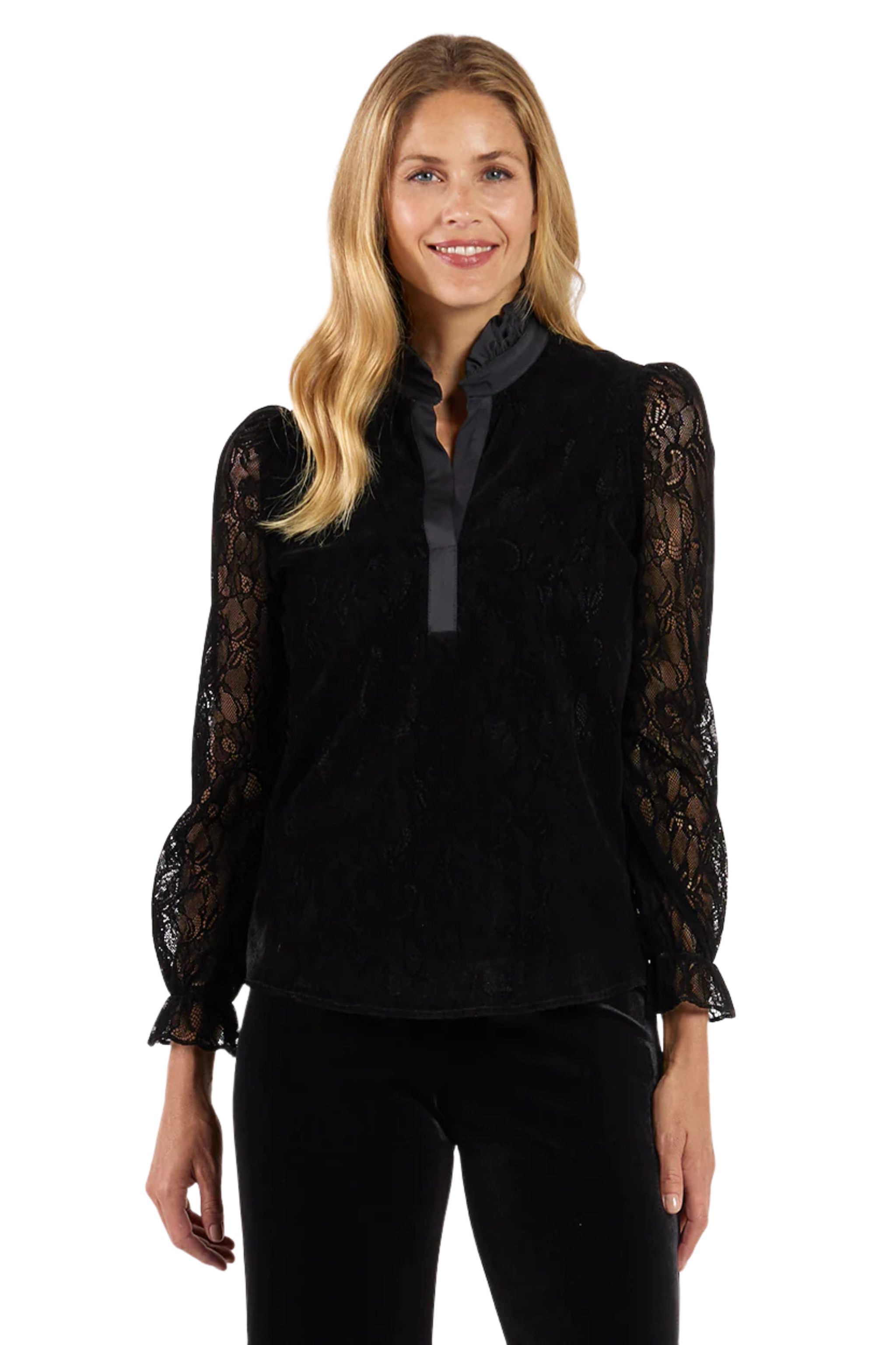 Meet Teri! A new flocked lace top designed with a flattering V-neckline and long sleeves, it features ruffle detailing at the neckline and fabric contrast at the collar and placket for a touch of sophistication. Romantic, feminine, and versatile, this beautifully crafted top is the perfect addition to your wardrobe for both polished workdays and elegant dinner parties.