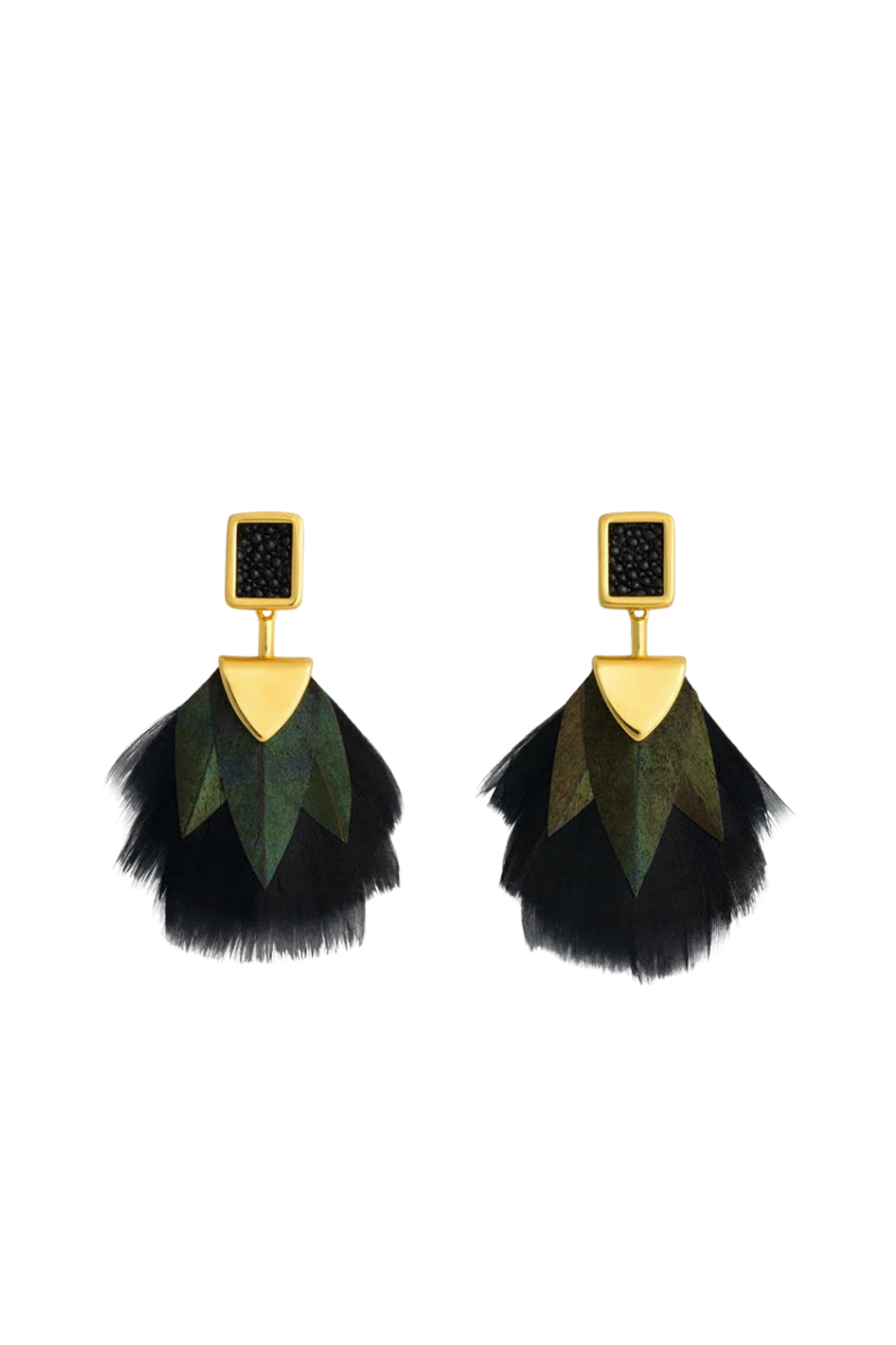 Bold and textural, the Elise Bezel Statement Earring is a fusion of natural elements and modern edge. Dyed goose and rooster feathers offer layered depth and vibrant  color, while genuine stingray leather introduces a striking contrast with its signature pebbled texture and subtle shimmer. Framed in a sleek bezel silhouette, Elise brings together organic movement and contemporary structure - a powerful statement piece with refined attitude.