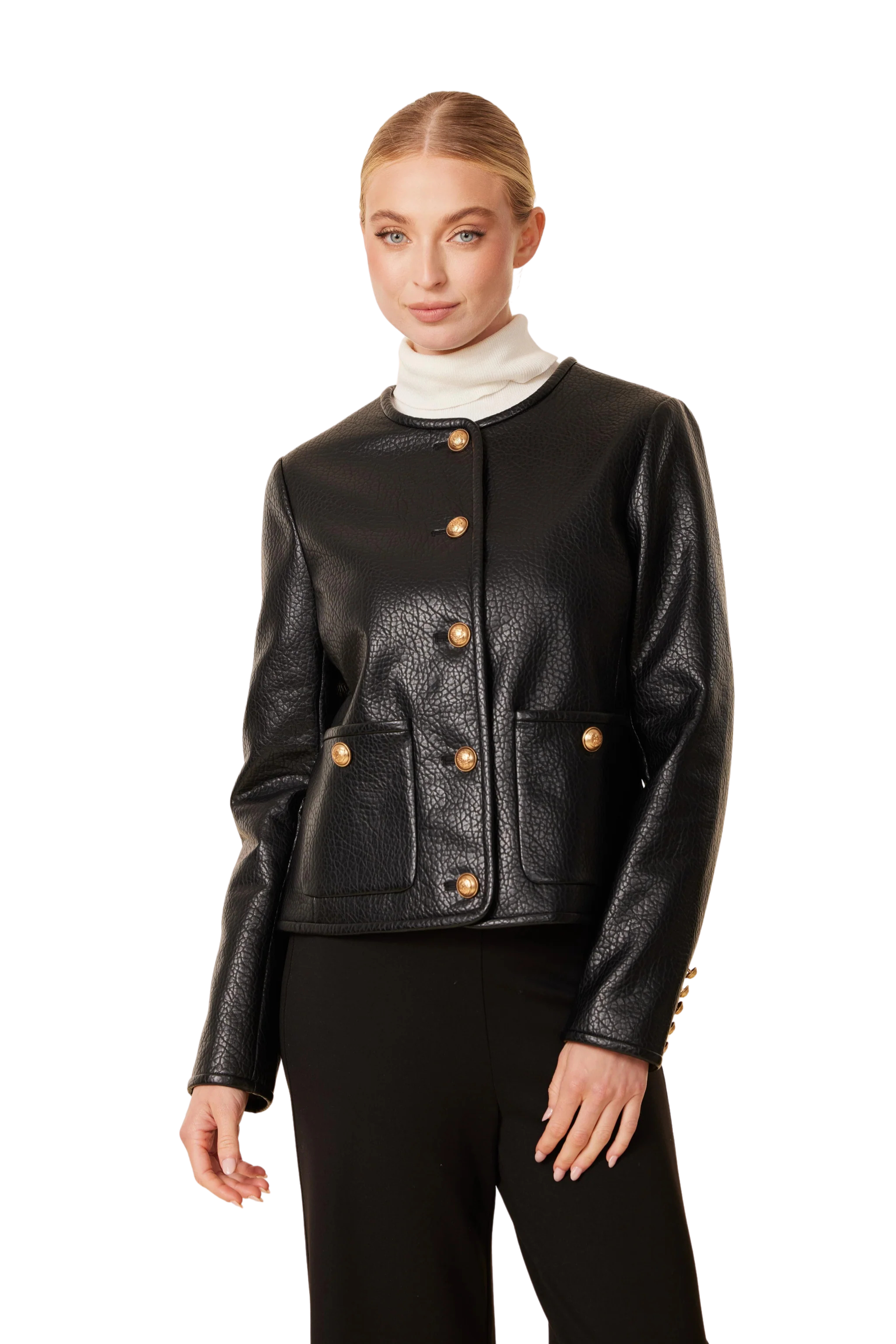 Refine your Fall style with our faux leather jacket, featuring a textured finish, gold statement buttons, and a classic round neckline. Designed with front patch pockets and tailored seams, this chic outerwear piece adds elegance to women’s Fall fashion while remaining versatile for day-to-night wear. Perfect for pairing with trousers, skirts, or dresses for a polished seasonal look.