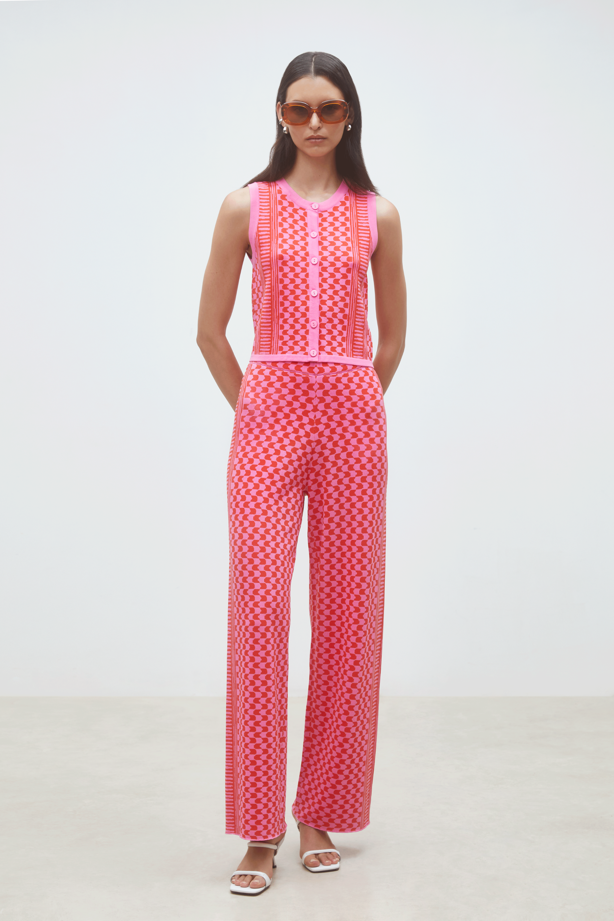 Bold yet wearable, the Gablesi Top in Rose adds a playful punch to any outfit. This sleeveless knit-style top features a button-front design and eye-catching geometric pattern in vibrant pink tones. Fitted but comfortable, it’s perfect paired with the matching skirt or styled with denim for an elevated everyday look with a retro-inspired twist.