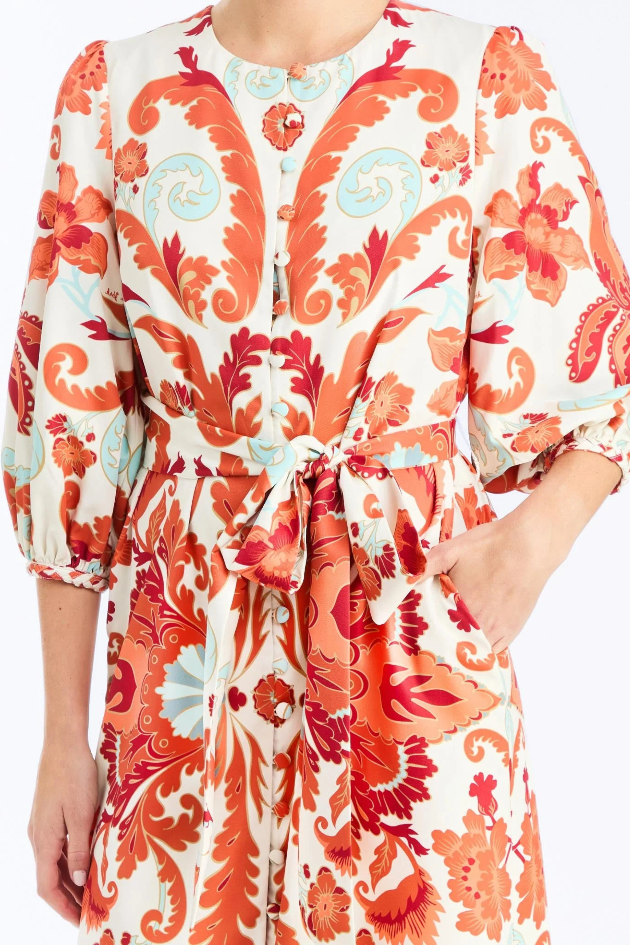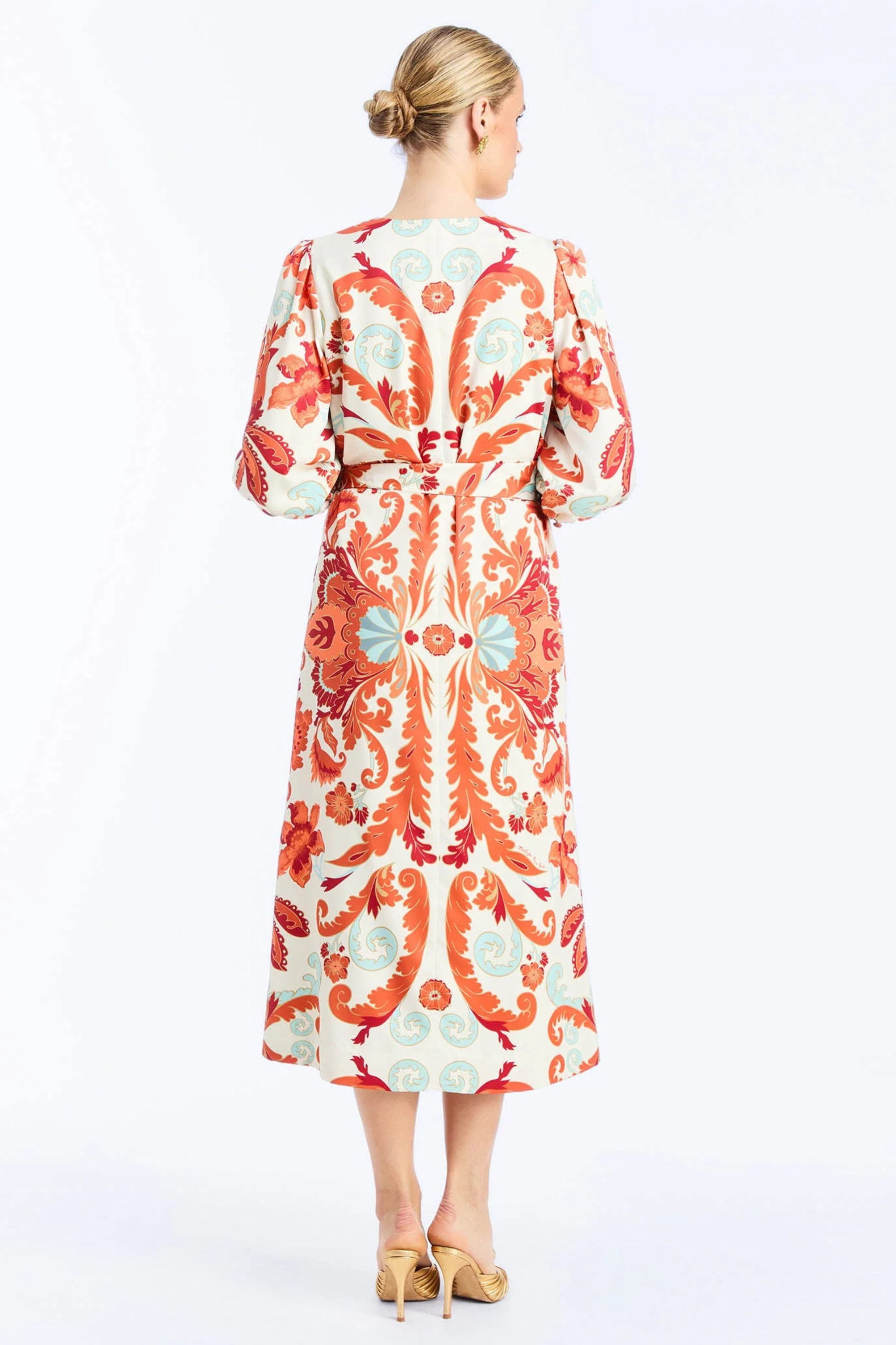 The Suzanna Midi Dress in Rossa Waltz brings effortless daytime elegance to every occasion. Designed in a new Mestiza print, this A-line midi features romantic three-quarter balloon sleeves, a flattering self-tie waist, and a beautifully draped skirt made for movement. Perfect for daytime events, luncheons, or polished weekends, it blends ease, femininity, and signature Mestiza charm.
